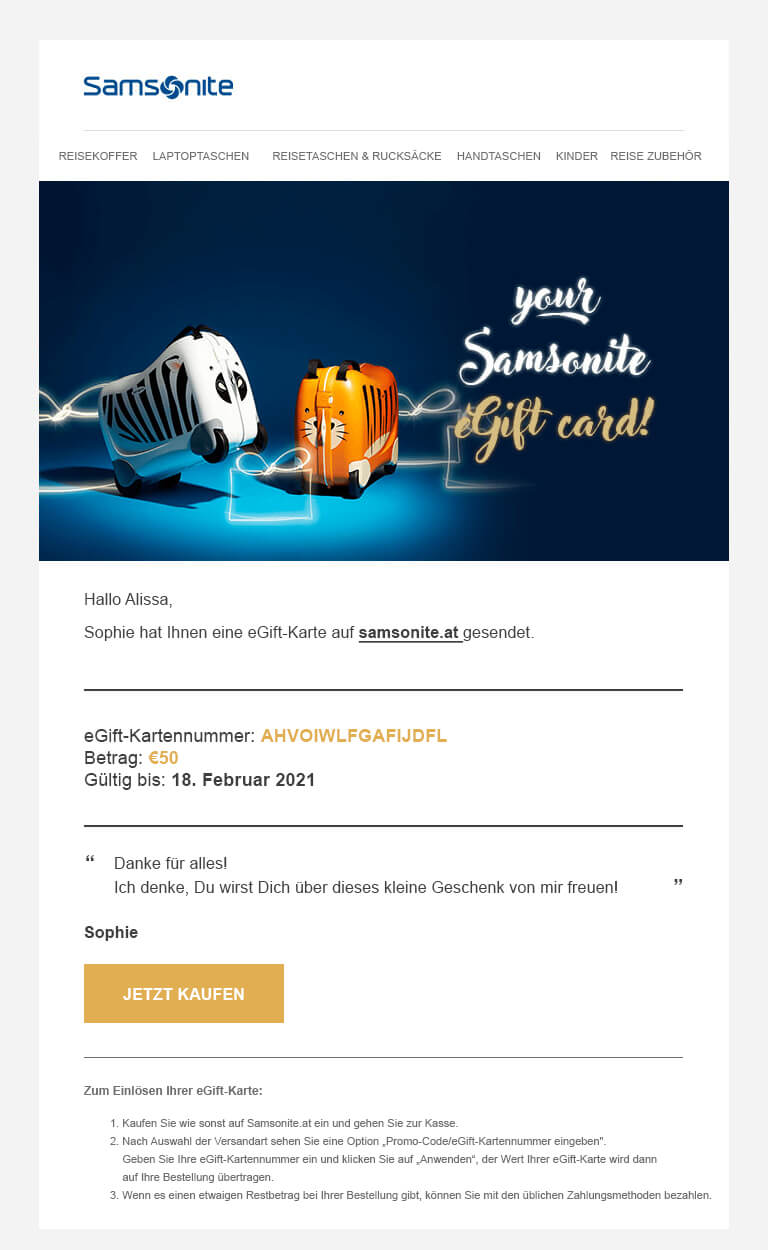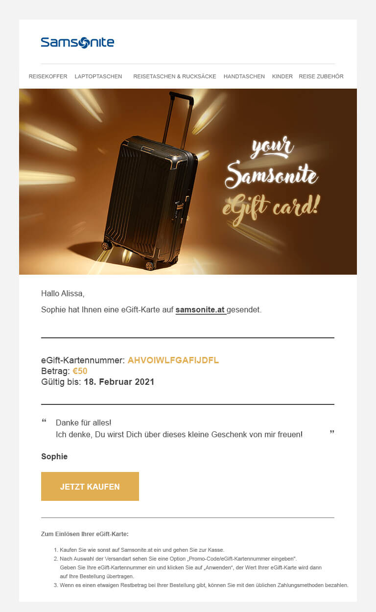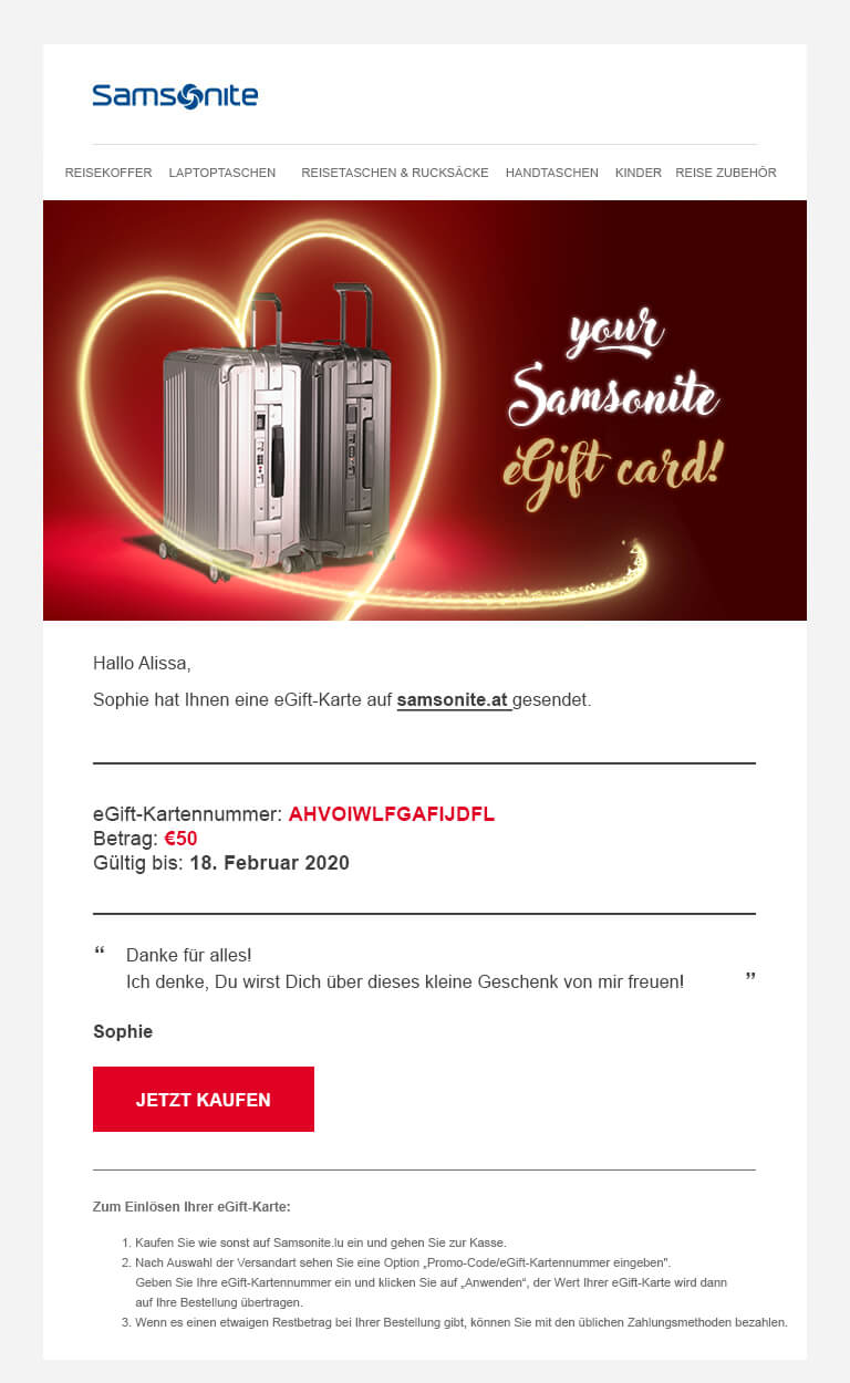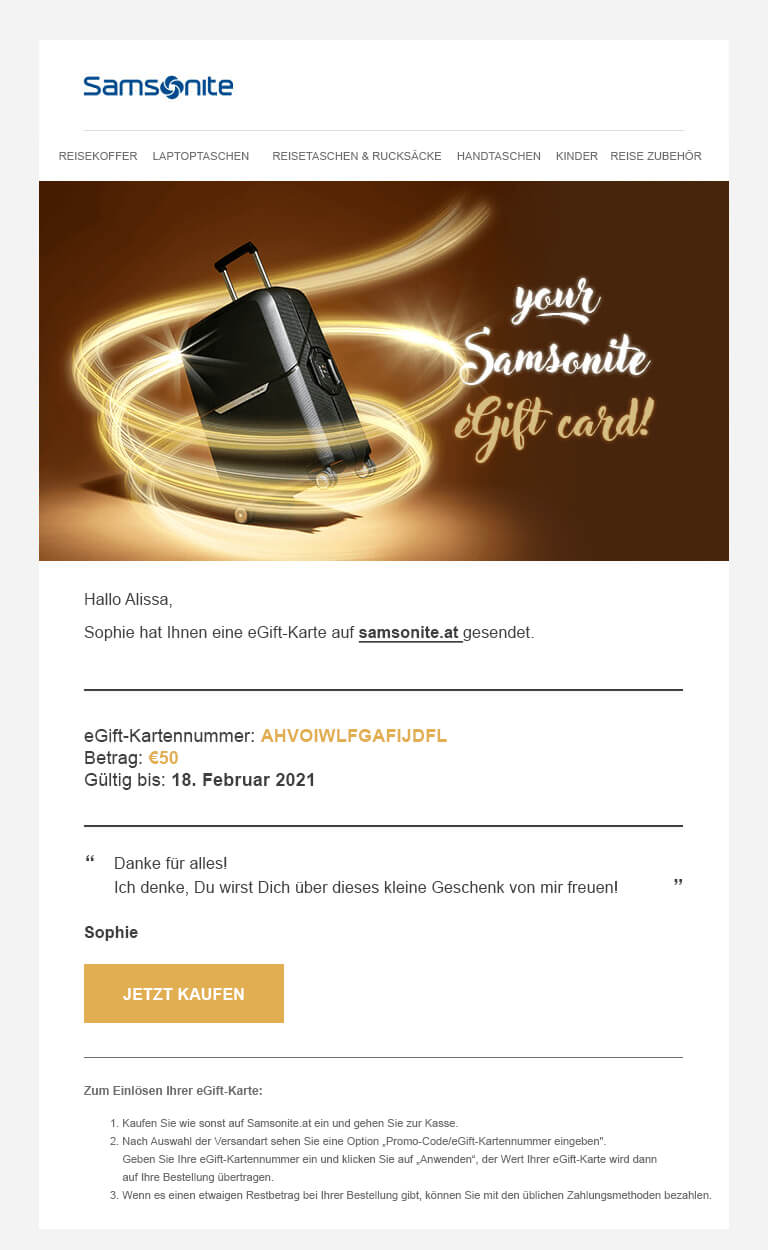 - Wenn Sie weitere Informationen über die eGift-Karte wünschen, können Sie eine E-Mail an customer.care@samsonite.com.